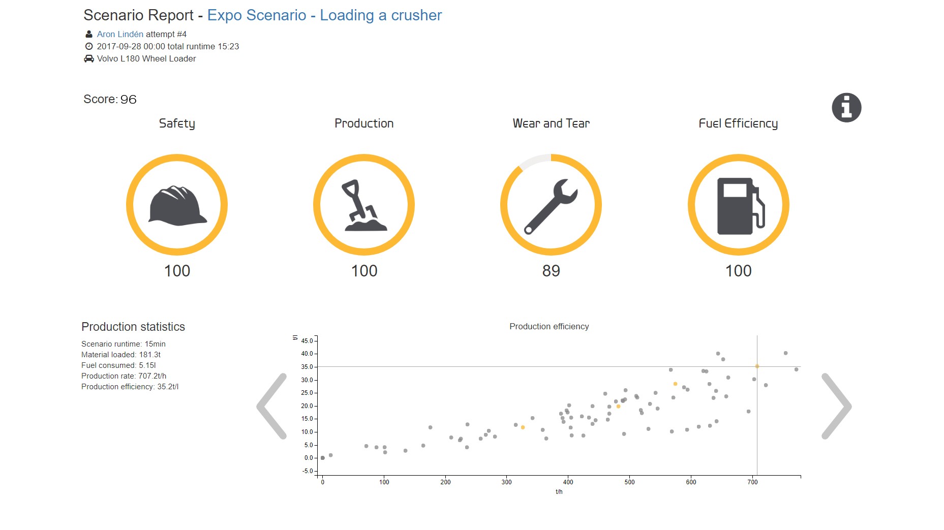 Following the completion of every scenario, operators receive a detailed performance report highlighting successes and areas for improvement. For instance, while achieving excellent completion time and production scores, the report may uncover issues such as high fuel consumption and unnecessary wear and tear. This capability not only identifies potential concerns difficult to detect with real machinery but also helps in cost mitigation and enhances overall safety.